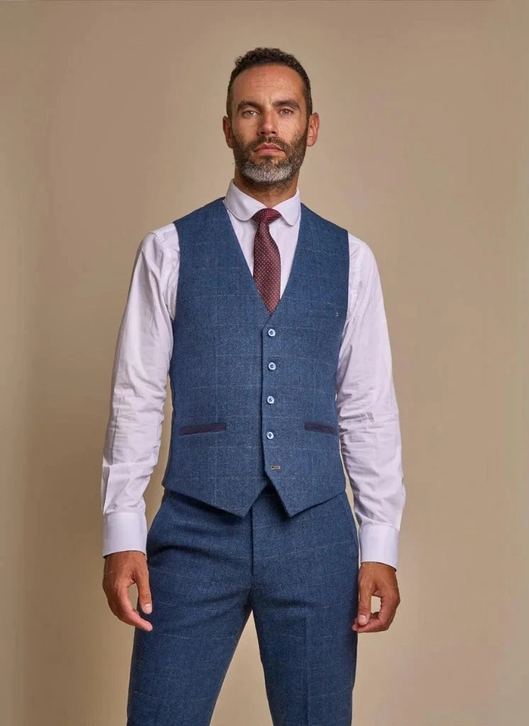 Der tiefblaue Tweed-Stoff und die blauen Knöpfe verleihen Ihnen eine authentische Ausstrahlung. Diese Weste strahlt Klasse und Stil aus und ist ideal für Männer, die mit einem klassischen Look auffallen wollen.