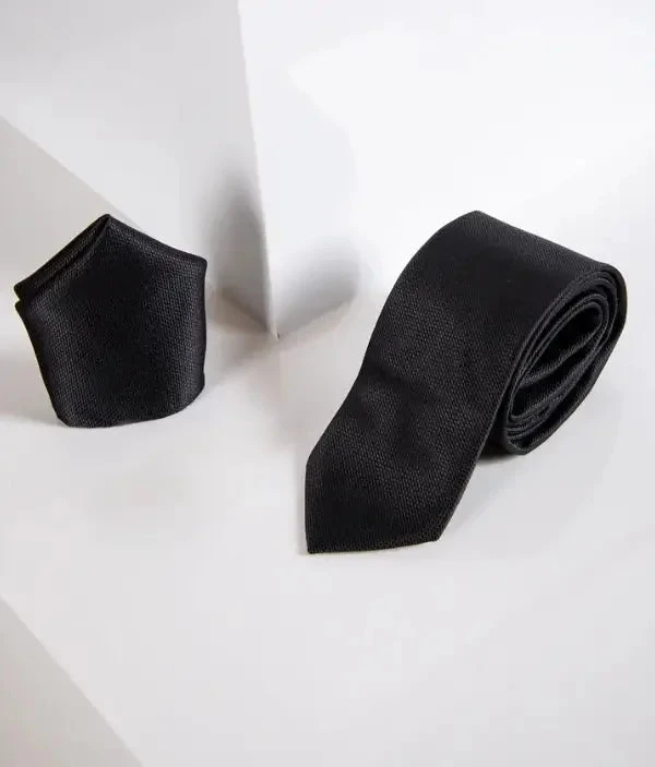 Die Krawatte ist ikonisch schwarz und glatt, sodass Sie sie wirklich zu jedem Outfit tragen können. Mit dem kompletten Set haben Sie sofort ein passendes Set von Accessoires, mit dem Sie gut aussehen werden!
