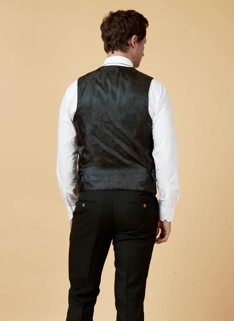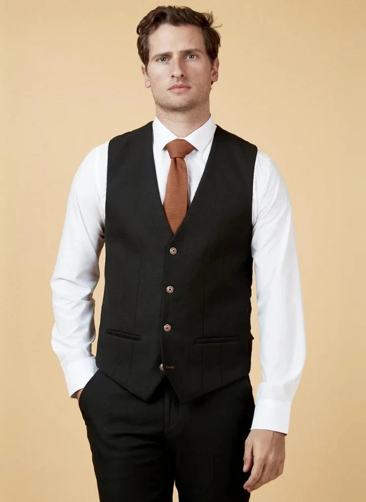 Die Marc Darcy Weste Max ist Teil eines kompletten schwarzen dreiteiligen Herrenanzugs. Dieser dreiteilige Anzug besteht aus einem Sakko, einer Hose und der Weste. Die Kombination dieser drei Teile sorgt für eine elegante und stimmige Optik. Du kannst die Weste sowohl alleine tragen als auch zusammen mit dem gesamten Anzug für formelle Anlässe.
